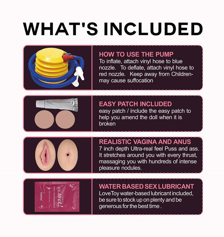 Fully-crafted from her face, she specially details with a pair of voluptuous realistic silicone breasts with real feel nipples. That is so amazing and different from other inflatable dolls in the market. Besides, she has tight realistic pussy and ass made from TPE - an ultra-real feel material that makes her tight entries feel amazing. Plunge into either to experience a 7 inch depth that stretches around you with every thrust, massaging you with hundreds of intense pleasure nodules.